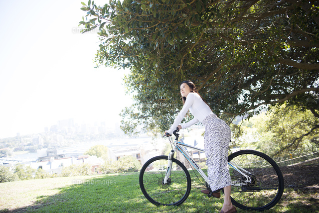 自転車にまたがっている女性 の写真素材 イラスト素材 アマナイメージズ