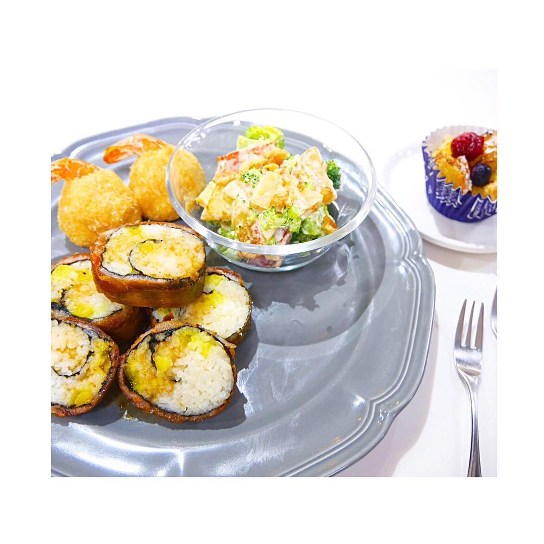 浦野一美 お弁当にできるレシピだけど 盛り付けてみました 肉巻きのお寿司 エビのポテトコロッケ ナッツのサラダ カップトーストケーキ そろそろお弁当も傷みやすいの Moe Zine