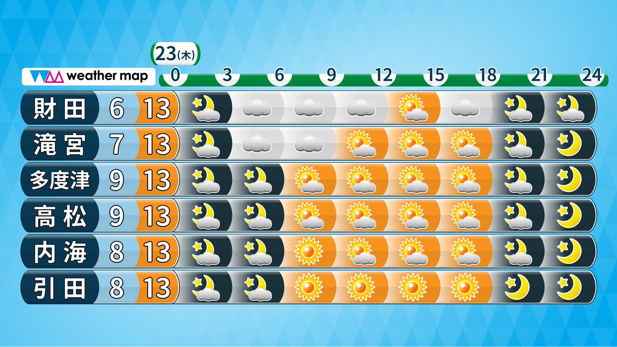 鈴木悠 気象予報士 V Twitter 4 22 水 あすは西讃を中心に雲が多いでしょう そのほかではだいたい晴れる見通しです 日中は 沿岸部を中心に引き続き西からの風がやや強めに吹くでしょう あすはきょうより空気が冷たく 最高気温は13度くらいの予想です 風が