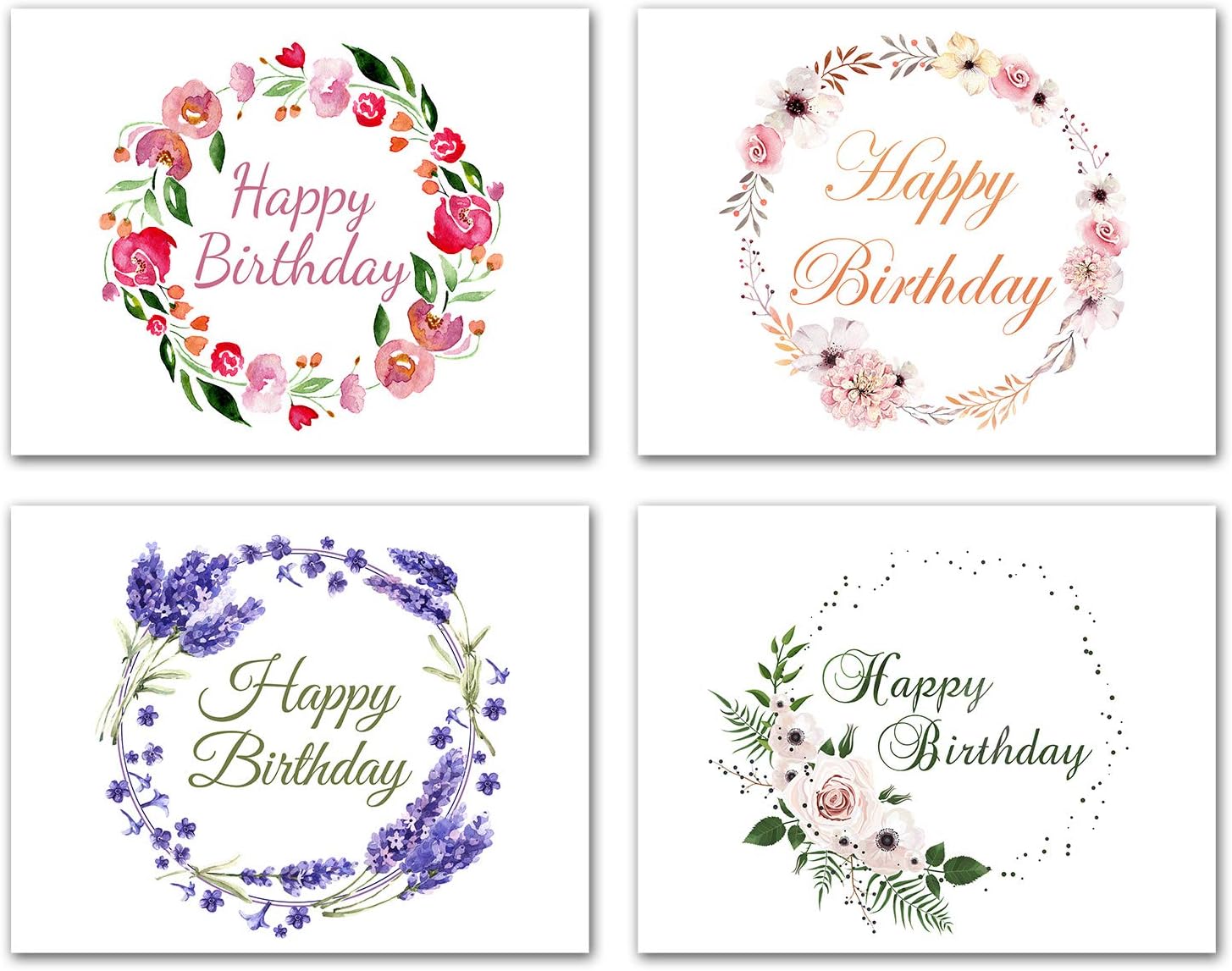 Amazon フローラルリース Happy Birthdayグリーティングカード 4つのユニークなデザイン 内側は空白 カード12枚と封筒付き 5 5インチ X 4 25インチ 12パック グリーティングカード 文房具 オフィス用品