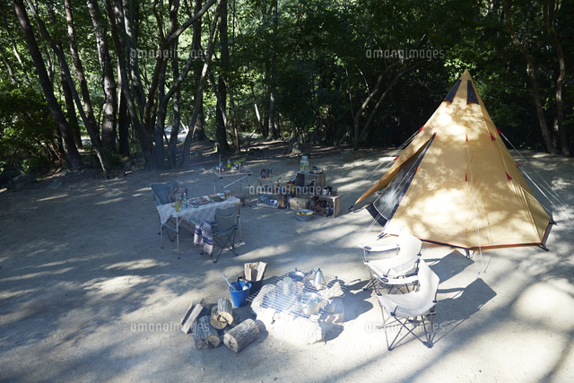 キャンプ場にセッティングされたキャンプグッズ の写真素材 イラスト素材 アマナイメージズ