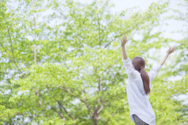 新緑に手を伸ばす女の子の後ろ姿 の写真素材 イラスト素材 アマナイメージズ